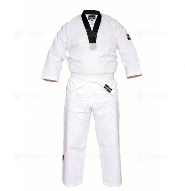 Кимоно предназначено для тренировок по тхэквондо. Соответствует всем необходимым требованиям WTF. Особенностью является белая куртка с черным воротом, надпись на двух языках и эмблема WTF на груди. Брюки на эластичной тесьме.