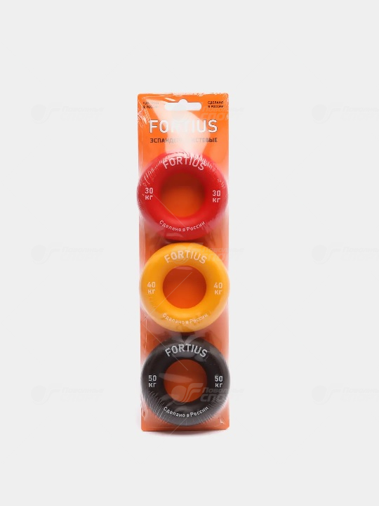 Набор кистевых эспандеров Fortius на подложке, 3 штуки. Изготовлен из гипоаллергенного, химически стойкого и прочного термоэластопласта. Из него производят детские игрушки, зубные щетки, медицинские изделия, а это значит - никакого вреда здоровью. Отлично подойдет для тренировки кистей, рук, запястий и предплечья. Имеет оптимальный размер, подходящий как для детей, так и для взрослых. Вы можете носить его с собой в кармане или сумке, чтобы заниматься в любое время. Благодаря специальной поверхности эспандер не выскользнет из рук. Характеристики: Нагрузка: 30, 40, 50 кг (±10%, в зависимости от внешних условий) Диаметр: 80 мм Материал: Термоэластопласт (ТЭП) Страна производитель: Россия