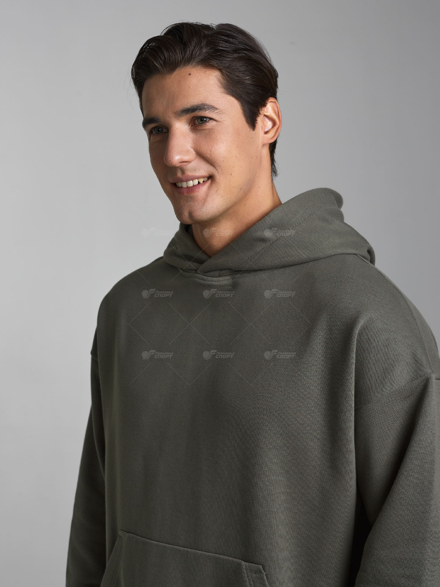 Мужской спортивный костюм из плотного трикотажа с петельной изнанкой. Верх комплекта - толстовка-худи с капюшоном, с накладным карманом "кенгуру". Рукава толстовки втачные, свободные со спущенной линией плеча, с эластичными манжетами. Брюки книзу заужены на резинку. Карманы брюк в боковых подрезах. Пояс брюк по линии талии дополнительно регулируется шнуром.
